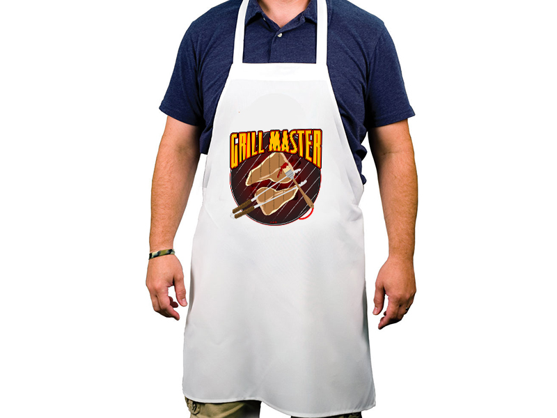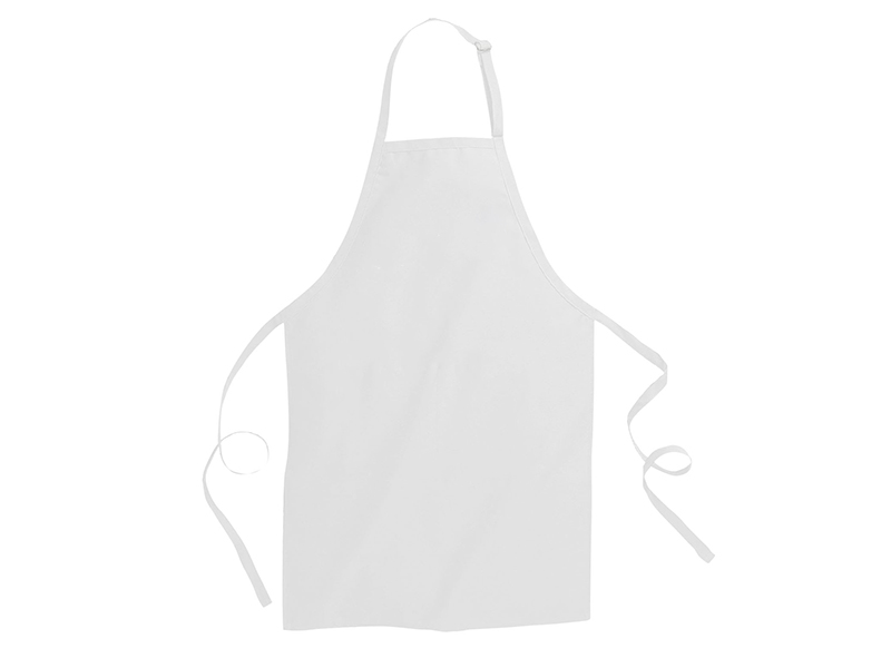 Nyakba akasztós fehér kötény, hátul kötővel. Egyedi képpel/grafikával.