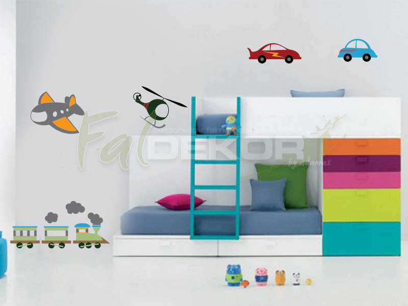 Tartalma: 2 darab kisautó (20x20cm), 1 darab repülő (20x20cm), 1 darab helikopter (20x20cm) és 1 darab kisvonat (40x20cm).